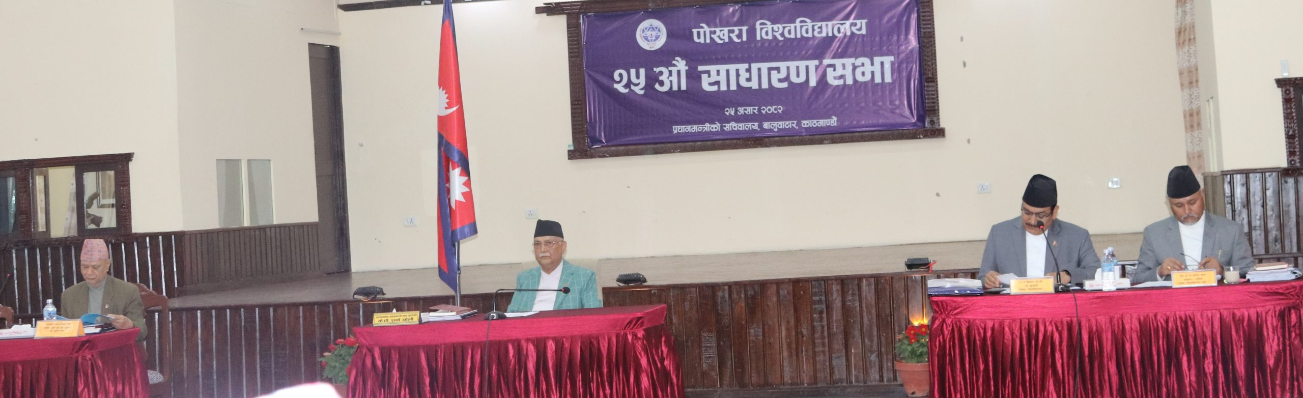 सम्माननीय प्रधानमन्त्री तथा पोखरा विश्वविद्यालयका कुलपति केपी शर्मा ओलीको अध्यक्षतामा २०८२ असार २५ गते बुधबार प्रधानमन्त्री निवास, बालुवाटारमा सम्पन्न पोखरा विश्वविद्यालयको २५औँ साधारण सभाले आर्थिक वर्ष २०८२/८३ का लागि विभिन्न नीति, कार्यक्रम र कुल १ अर्ब ५४ करोड बराबरको बजेट पारित गरेको छ। साथै, सभामा विश्वविद्यालयका विभिन्न नियमावलीहरूमा संशोधन गर्ने प्रस्तावहरू स्वीकृत गर्नुका साथै केही महत्वपूर्ण नीतिगत निर्णयहरू पनि पारित गरिएको छ।