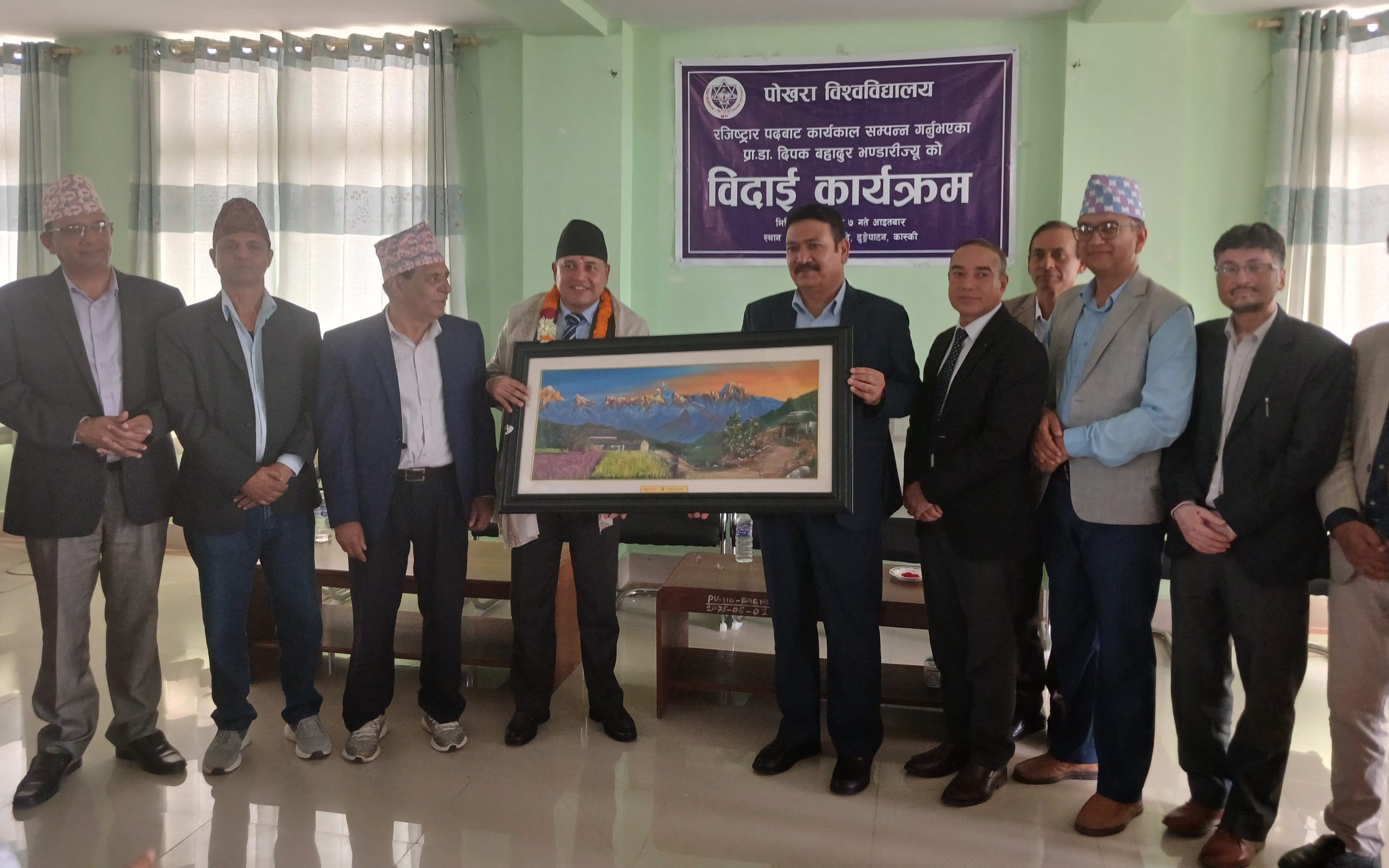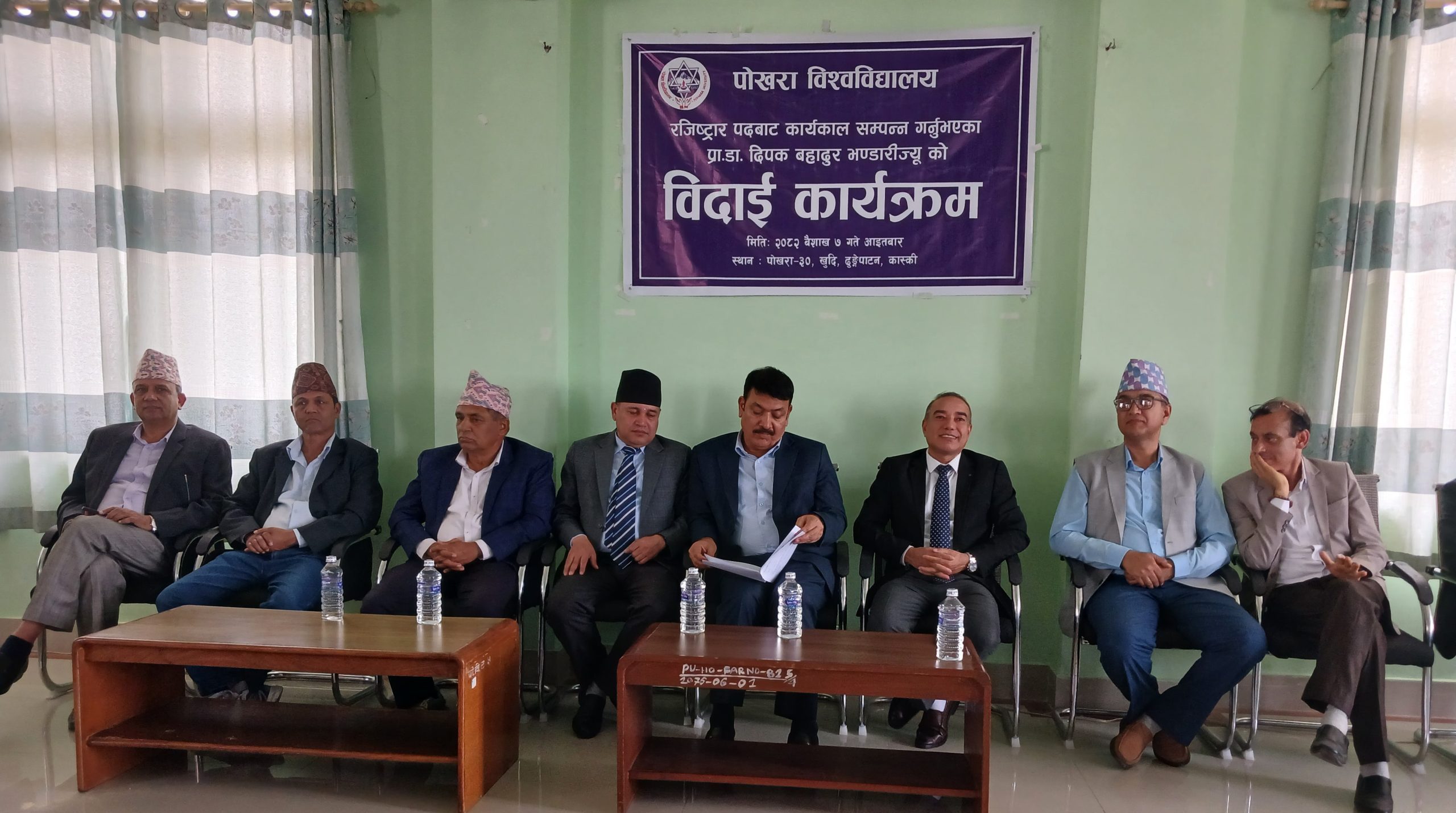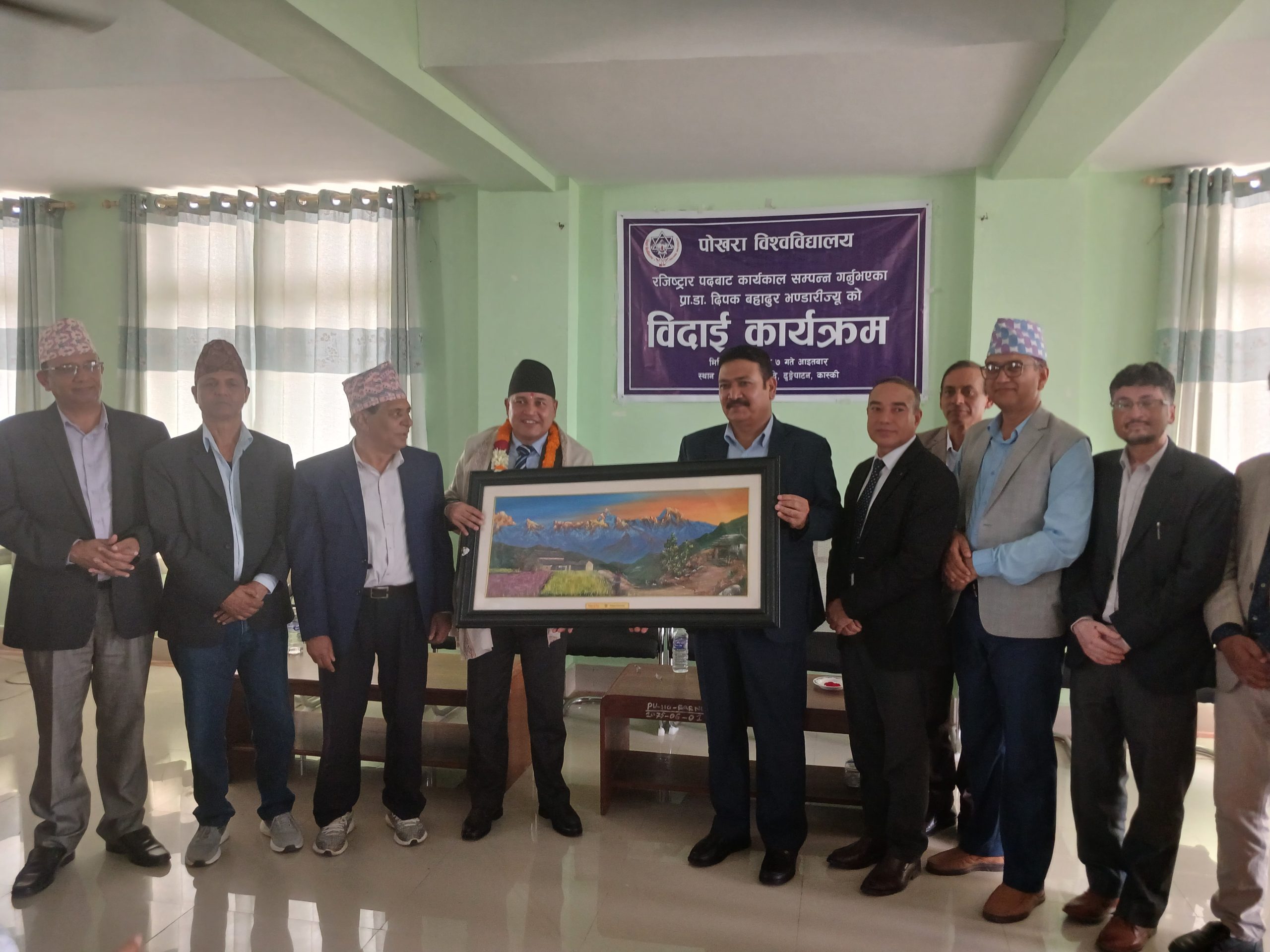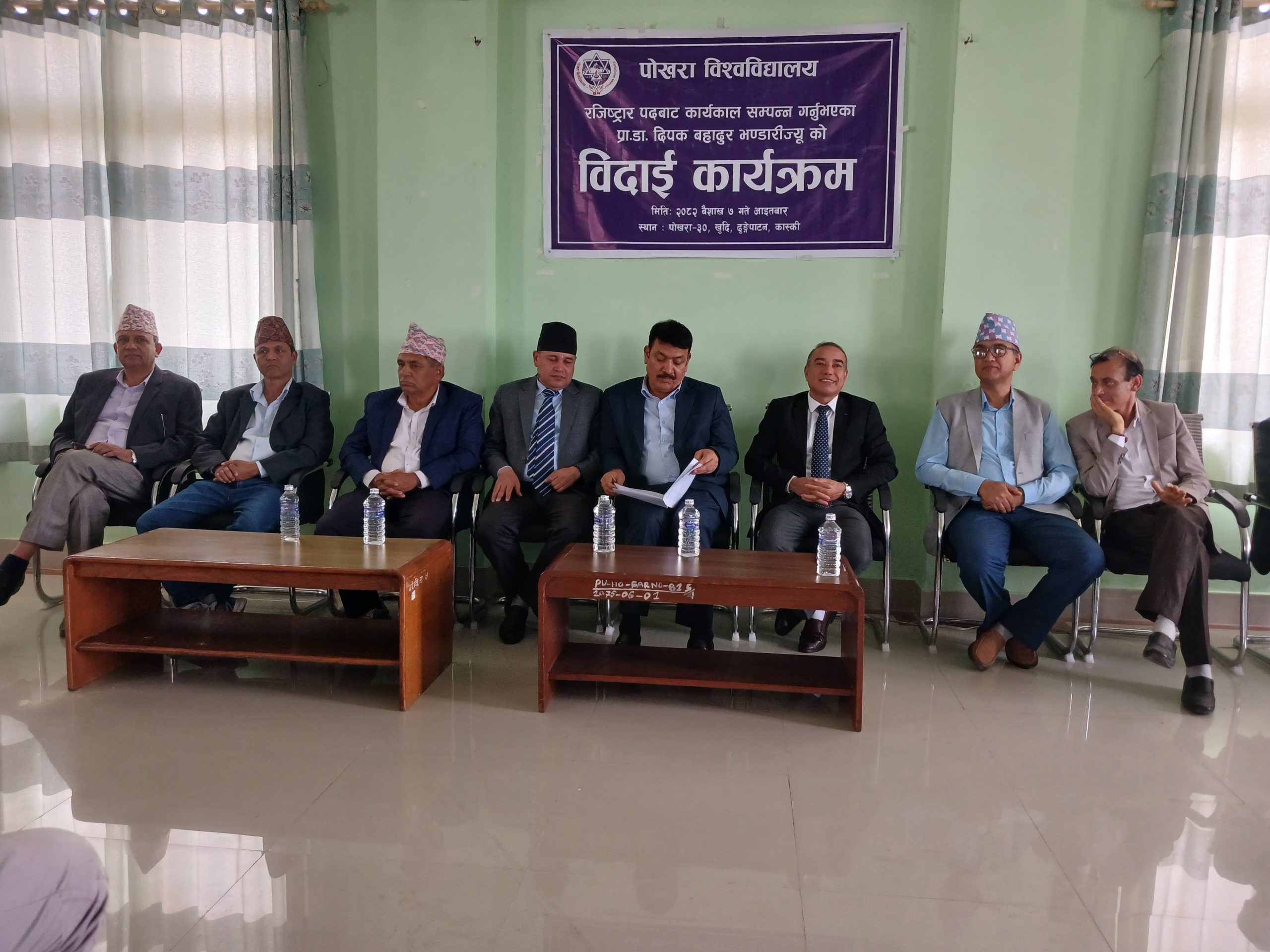पोखरा विश्वविद्यालयका रजिष्टार पदबाट कार्यकाल सम्पन्न गर्नुभएका प्रा.डा. दिपकबहादुर भण्डारीलाई विश्वविद्यालयले एक औपचारिक कार्यक्रमको आयोजना गरी बिदाई गर्यो । विश्वविद्यालयको केन्द्रीय कार्यालयको सभाकक्षमा आयोजित बिदाई कार्यक्रममा विश्वविद्यालयका पदाधिकारी, प्राध्यापक, कर्मचारी तथा विभिन्न निकायका शिक्षक, कर्मचारीहरुको उपस्थिति रहेको थियो। प्रा.डा. भण्डारीले २०७८ वैशाख ५ गतेदेखि २०८२ वैशाख ४ गतेसम्म विश्वविद्यालयको रजिष्टार पदमा रही सेवा दिनुभएको थियो।