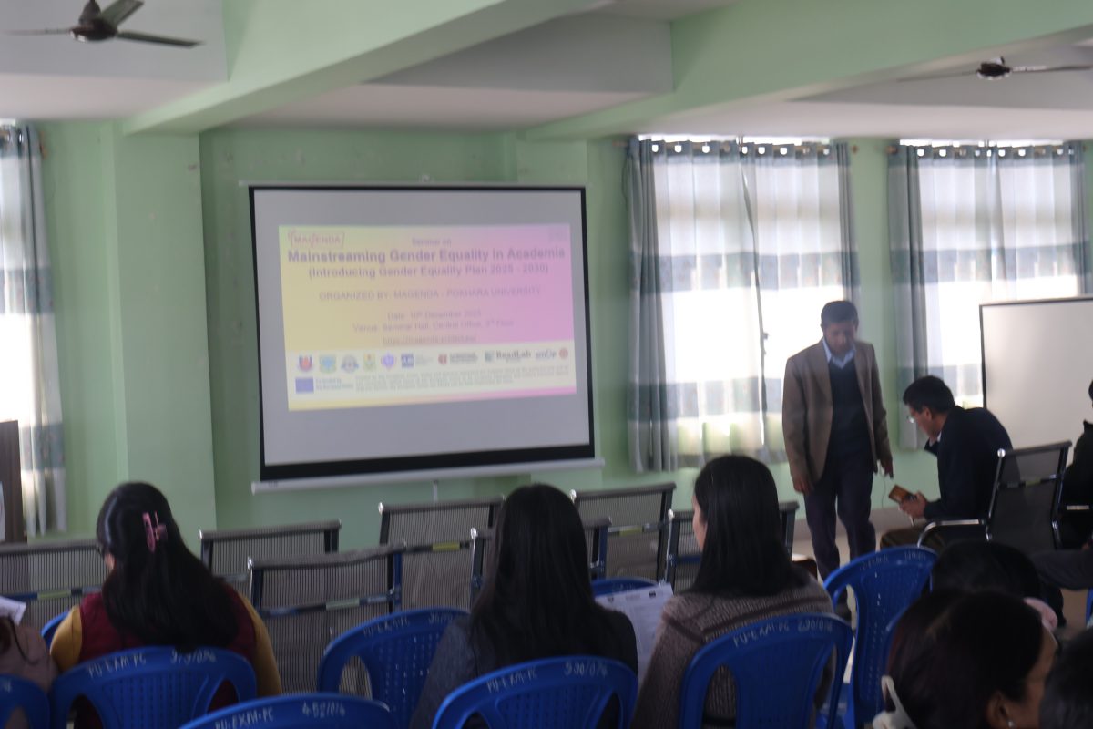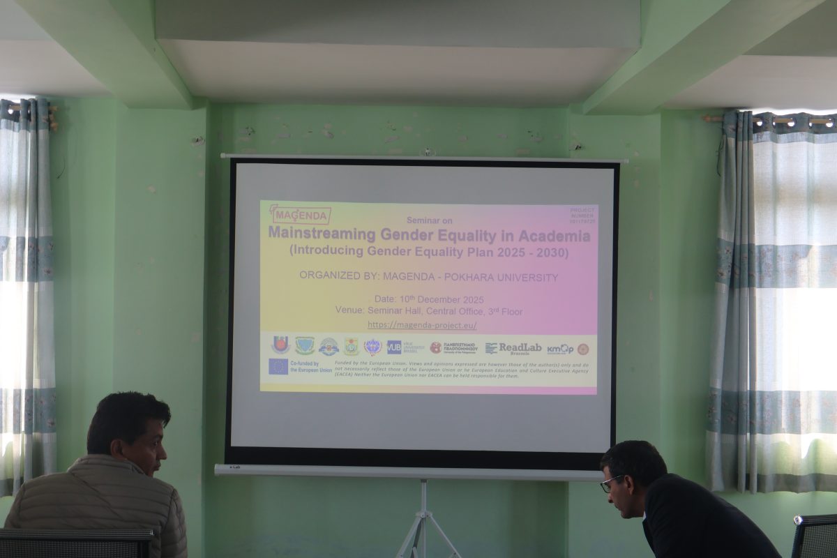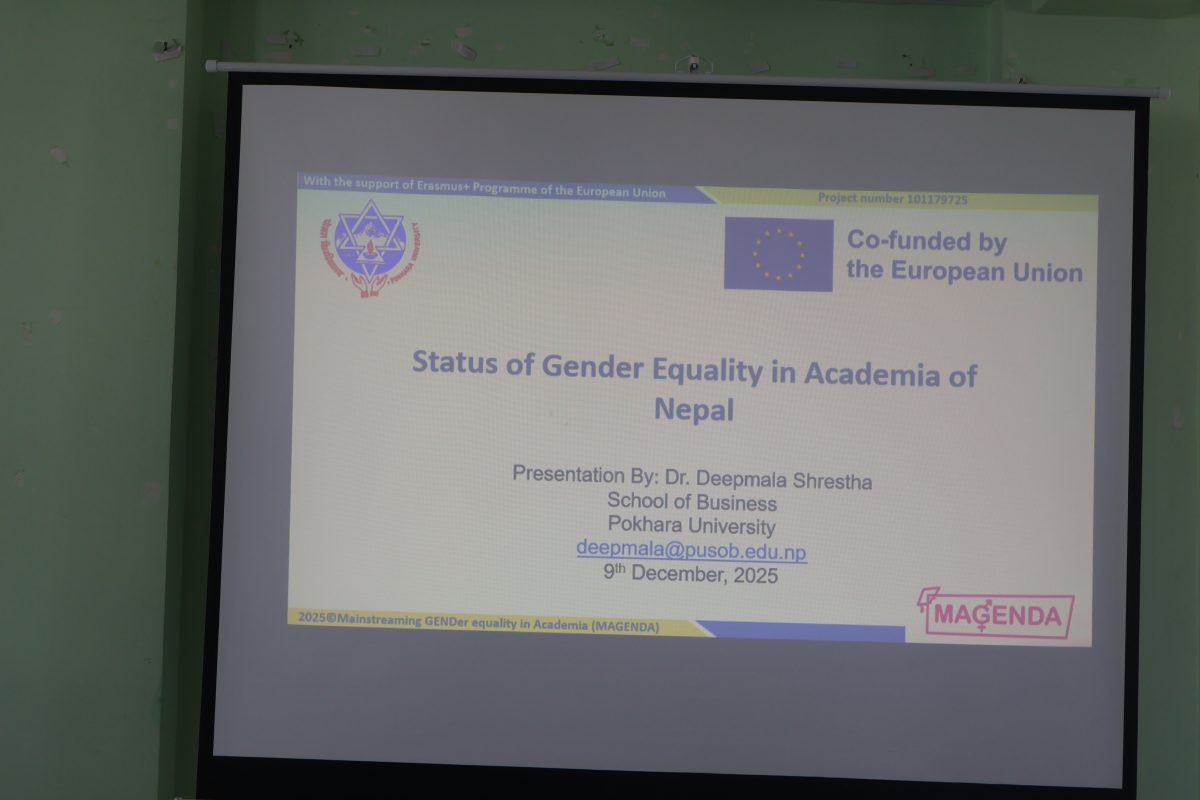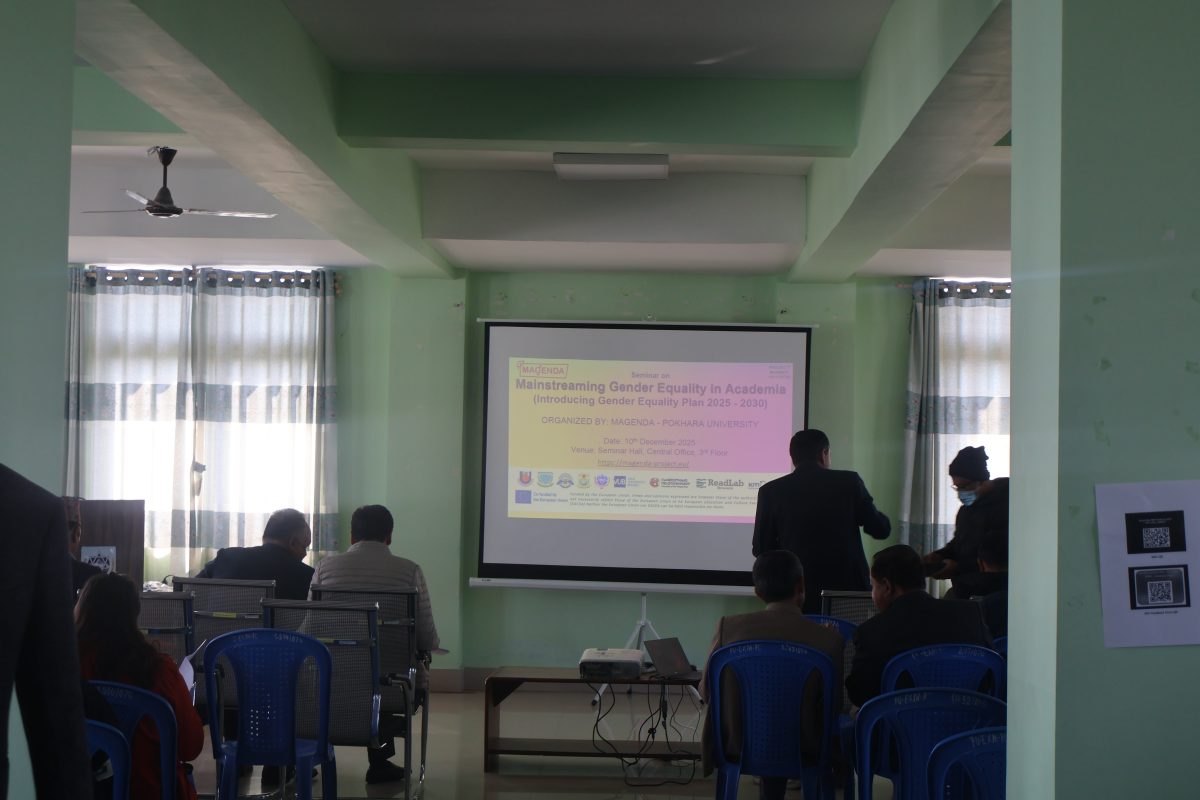 पोखरा विश्वविद्यालयले विश्व मानव अधिकार दिवसको अवसर पारेर उच्च शिक्षामा लैङ्गिक समानतालाई संस्थागत रूपमा मजबूत बनाउने उद्देश्यले सञ्चालन भइरहेको MAGENDA (Mainstreaming Gender Equality in Academia) परियोजना अन्तर्गत ‘Gender Equality Plan (GEP) 2025-2030’ विषयक विशेष अभिमुखीकरण तथा छलफल कार्यक्रम विश्वविद्यालय केन्द्रीय कार्यालयको सेमिनार हलमा सम्पन्न गरेको छ। कार्यक्रममा MAGENDA परियोजनाका अद्यावधिक गतिविधिहरू, नेपालमा रहेको लैङ्गिक समानताको वर्तमान अवस्था, मानव अधिकार र लैङ्गिक समानताको सम्बन्ध, तथा पोखरा विश्वविद्यालयले कार्यान्वयन गर्ने गरि तयार पारेको GEP 2025-2030 को प्रारम्भिक मसौदाबारे विस्तृत प्रस्तुति तथा छलफल गरिएको थियो।