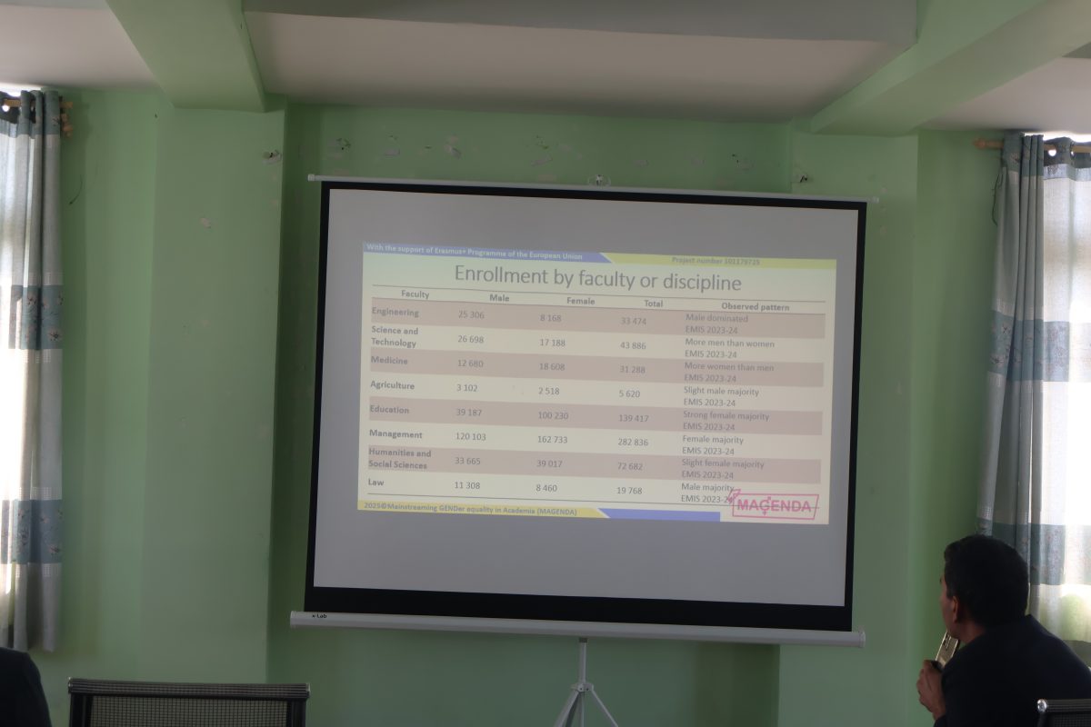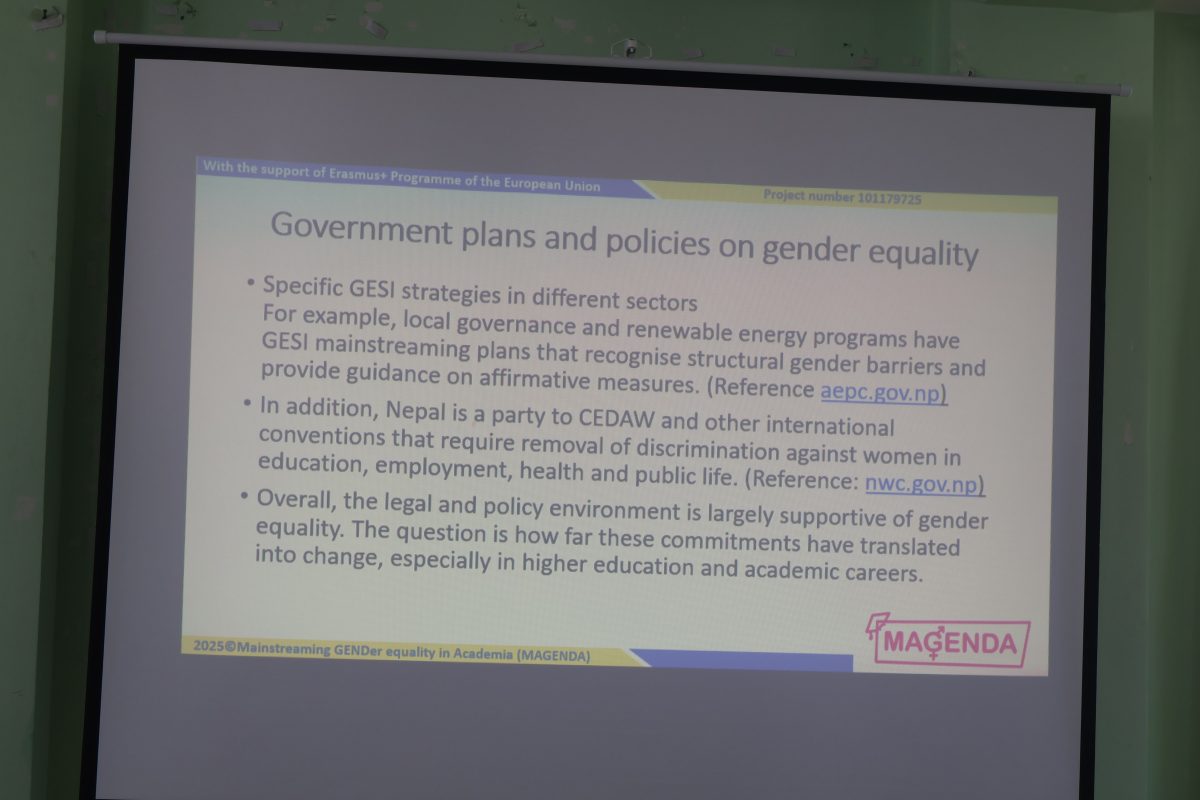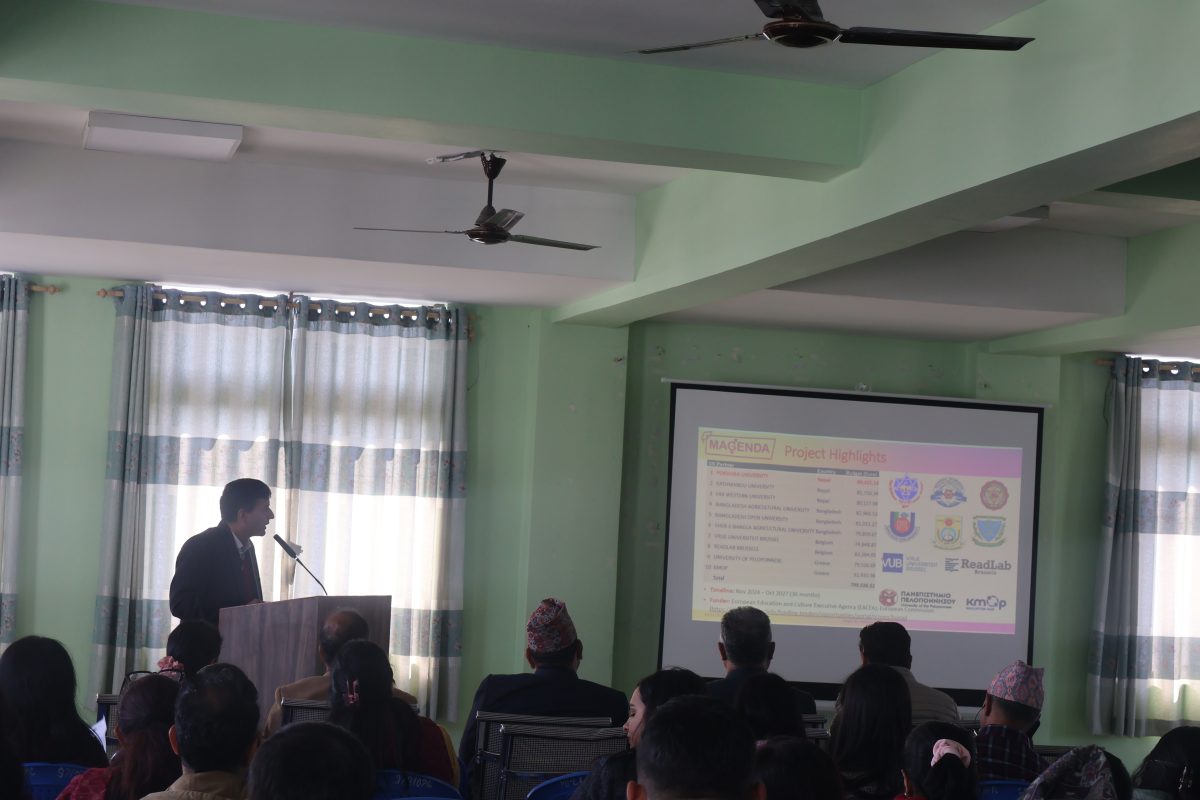 कार्यक्रममा परियोजनाका संयोजक सह प्राध्यापक डा. नमराज धामीले MAGENDA परियोजनाको उद्धेश्य, वर्तमान प्रगति र आगामी कार्ययोजनाबारे जानकारी गराउँदै परियोजनाले नेपाल, बङ्गलादेश र युरोपका विश्वविद्यालयहरूको सहकार्यमा २०२४ देखि २०२७ सम्मका तीन वर्षमा उच्च शिक्षामा लैङ्गिक समानताका लागि संरचनागत सुधार ल्याउने लक्ष्यसहित अघि बढिरहेको बताउनुभयो। उहाँले Gender Equality Plan निर्माण, प्रशिक्षण तथा संस्थागत क्षमता विकास परियोजनाका प्रमुख गतिविधि रहेको उल्लेख गर्नुभयो।