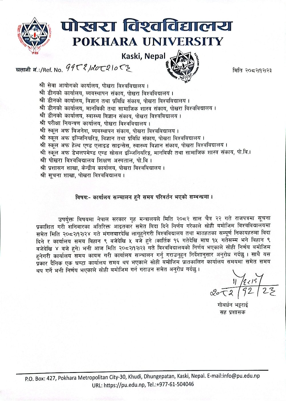 कार्यालय सञ्चालन हुने समय परिवर्तन भएको सम्बन्धमा ।