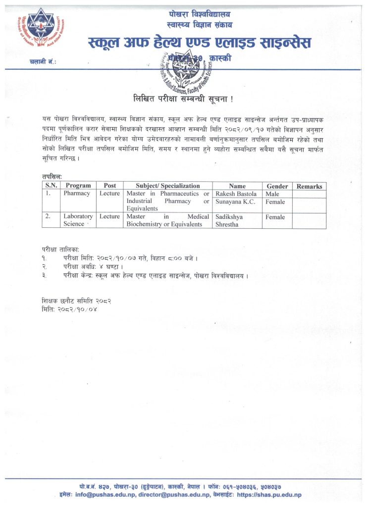 - पोखरा विश्वविद्यालय परीक्षा नियन्त्रण कार्यालयको सह-परीक्षा नियन्त्रक नियुक्तिका लागि उम्मेदवारहरूको Shortlist प्रकाशन सम्बन्धी सूचना !