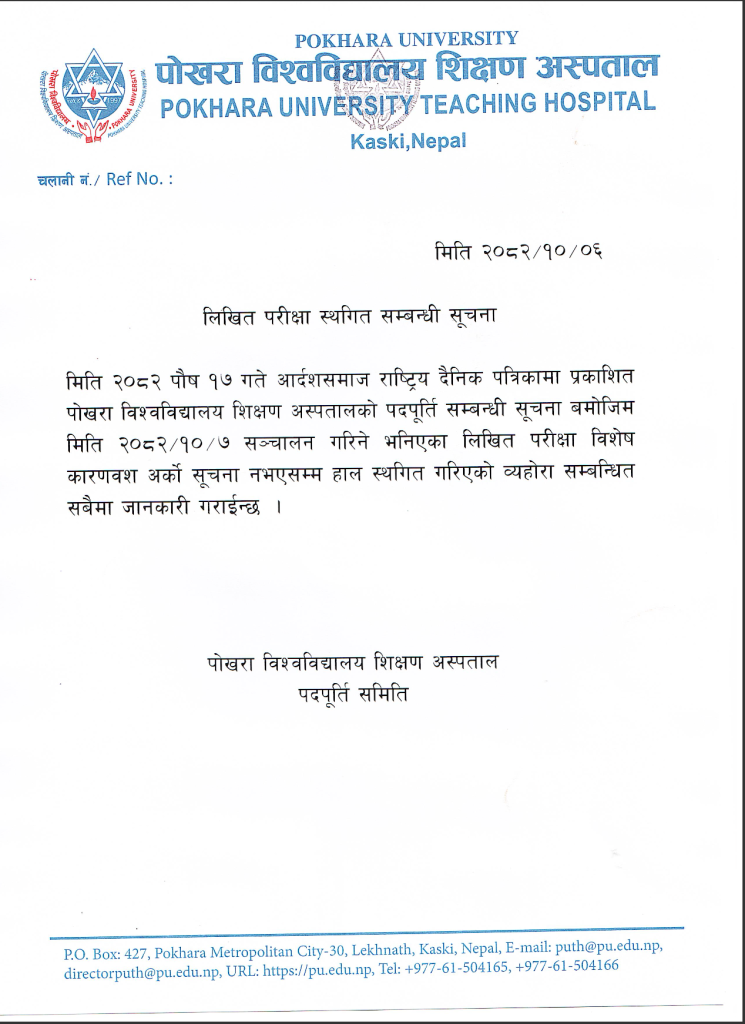- पोखरा विश्वविद्यालय परीक्षा नियन्त्रण कार्यालयको सह-परीक्षा नियन्त्रक नियुक्तिका लागि सिफारिस गर्न गठित सिफारिस समितिको दरखास्त आह्वान सम्वन्धी सूचना !