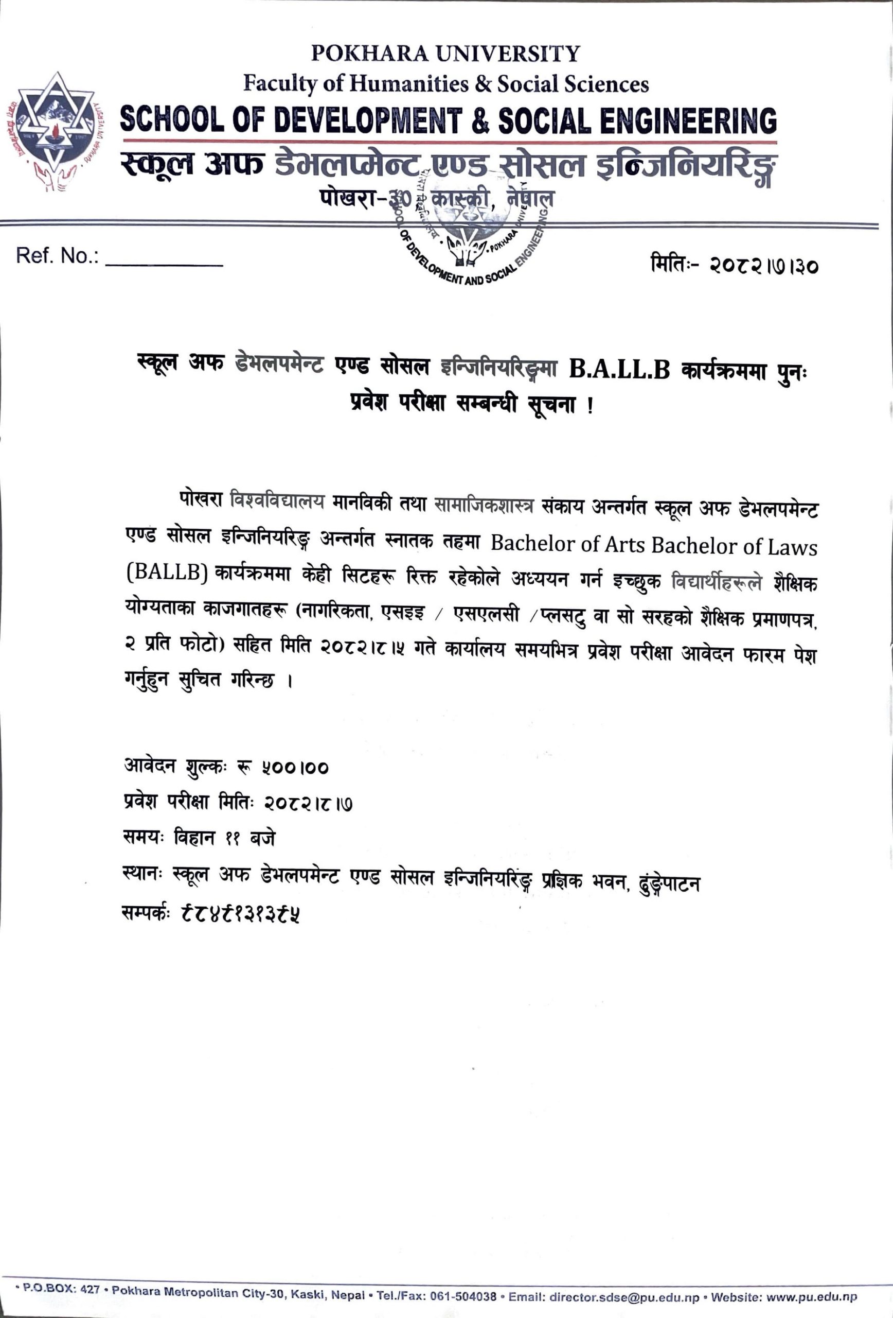 स्कूल अफ डेभलपमेन्ट एण्ड सोसल इन्जिनियरिङ: B.A.LL.B. कार्यक्रमको पून: प्रवेश परीक्षा सम्बन्धी सूचना !