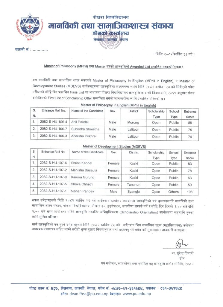 मानविकी तथा सामाजिकशास्त्र संकाय अन्तर्गतको Master of Philosophy (MPhil) तथा Master तहको छात्रबृत्तिको Awarded list प्रकाशित सम्बन्धी सूचना !