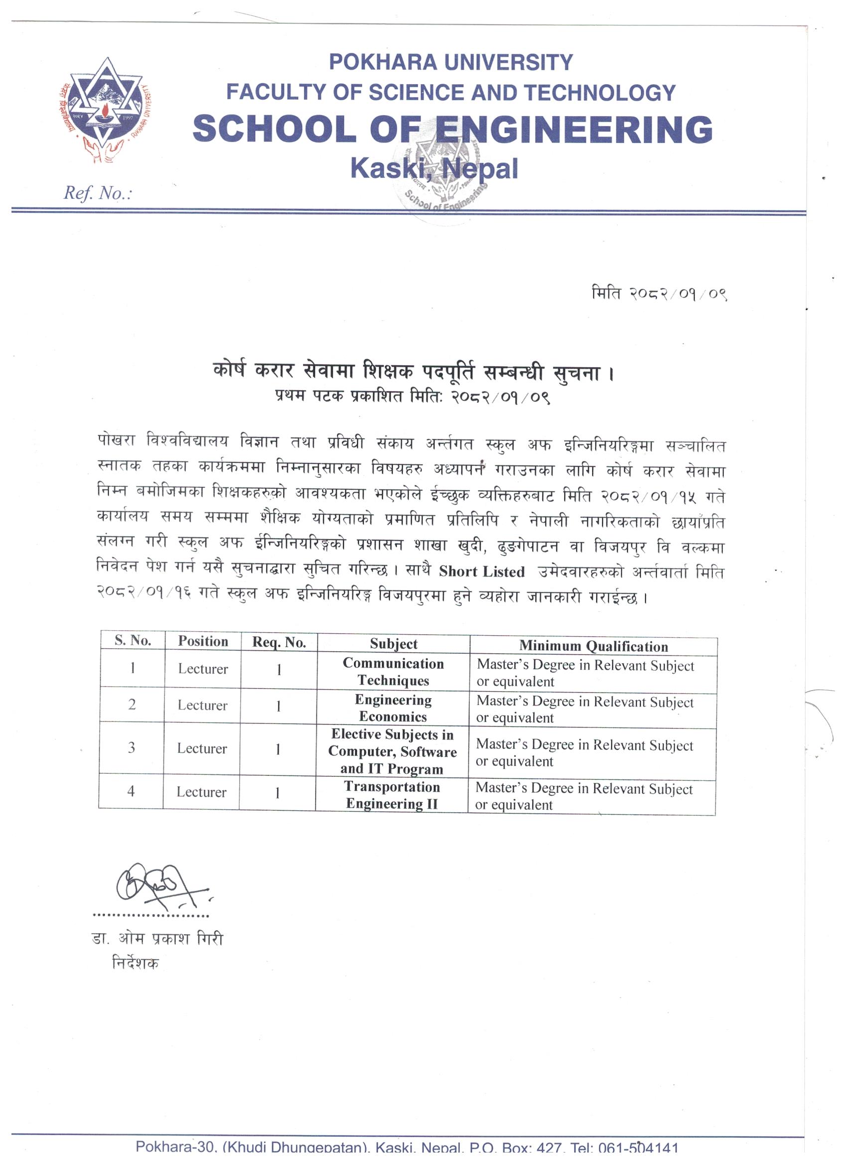 School of Engineering: कोर्ष करार सेवामा शिक्षक पदपुर्ति सम्बनधी सूचना !